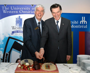 Le recteur de l'Université de Montréal, M. Robert Lacroix, et le président et vice-chancelier de l'Université de Western Ontario, M. Paul Davenport, ont conjointement souligné le 125e anniversaire de leurs établissements lors d'une célébration qui a eu lieu le 23 avril dernier au Centre d'exposition de la Faculté de l'aménagement. «L'Université de Montréal et l'Université de Western Ontario ont le même âge et c'est pour notre établissement un grand honneur d'avoir une sœur jumelle dans la province voisine du Québec», a dit M. Robert Lacroix en introduction au discours qu’il a prononcé en présence d'une centaine d'invités et du président du bureau du 125e , M. Jacques Boucher.
