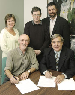 Les signataires de l’entente entre les chargés de cours et la direction de l’Université de Montréal: à l’arrière-plan, Dominique Barot, vice-présidente à la Convention collective; Yves Lépine, directeur adjoint du Bureau du personnel enseignant (BPE), et son collègue Marc Marandola, conseiller en relations de travail; à l’avant-plan, Charles Overy, président du SCCUM, et Dominique Maestracci, directeur du BPE. |