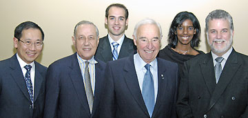 Le 24 octobre dernier, les étudiants de la Faculté de pharmacie ont reçu Philippe Couillard, ministre de la Santé et des Services sociaux, venu souligner leur installation dans le pavillon Jean-Coutu. Plus d’une centaine d’étudiants et des invités de marque tels que Jean Coutu, Morris Goodman et Michel Saucier s’étaient rassemblés pour entendre le ministre Couillard, le recteur Luc Vinet, l’administrateur exerçant les fonctions de doyen Huy Ong, ainsi que Jean-Maurice Weibel et Marie-Christine Jones, représentants respectivement des étudiants de premier cycle et des étudiants des cycles supérieurs. M. Ong a profité de l’occasion pour remercier chaleureusement MM. Coutu et Goodman, pharmaciens diplômés en 1953: «L’existence de ce pavillon n’aurait pas été possible sans votre vision et votre générosité. Vous avez cru en votre profession et nous avez permis d’avoir cet environnement des plus enviables pour former les générations de pharmaciens à venir et accomplir ainsi notre devoir envers la collectivité au Québec.» Pour sa part, le ministre s’est dit préoccupé par la pénurie de pharmaciens qui sévit notamment en milieu hospitalier. Il a mentionné à quel point le pharmacien était un professionnel important dans le secteur de la santé. |
