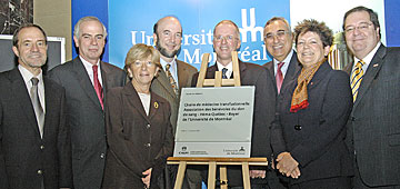 L’Université a inauguré, le 1er novembre, la Chaire de médecine transfusionnelle Association des bénévoles du don de sang – Héma-Québec – Bayer, qui jouera un rôle important dans la recherche, la formation et l’application de la médecine transfusionnelle au Québec. La Chaire bénéficiera d’un investissement de deux millions de dollars. Sur notre photo, de gauche à droite: le Dr Denis Roy, directeur du Département de médecine de la Faculté de médecine; Patrick Molinari, président du conseil d’administration du CHUM; Monique Lefebvre, présidente du conseil d’administration de la Fondation Héma-Québec; le recteur, Luc Vinet; le Dr Jean-François Hardy, titulaire de la Chaire; Ekram Rabbat, président-directeur général de la Fondation du CHUM; la Dre Francine Décary, présidente et chef de la direction d’Héma-Québec; et Guy Berthiaume, vice-recteur au développement et aux relations avec les diplômés. |