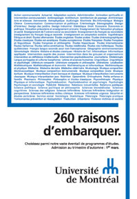 Depuis le début du mois de janvier, des affiches annonçant la date de la tenue des Portes ouvertes (le 8 février) sont exposées dans les wagons du métro. Dès le 6 février, des lumiquais, sorte de panneaux illuminés de grand format, portant le slogan «260 raisons d’embarquer», attireront l’attention des usagers du transport souterrain dans la majorité des stations. Ils sont l’œuvre de Cossette communication-marketing. |