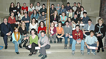 Le 14 décembre dernier avait lieu la cérémonie de remise de bourses 2005-2006 organisée par le Fonds de développement. Répartis dans quatre catégories: bourses Mille et un métiers (destinées aux étudiants qui ont une déficience fonctionnelle), bourses d’études et de soutien financier (pour encourager les étudiants aux prises avec des difficultés financières), bourses au mérite (excellence du dossier scolaire) et bourses d’accueil, les 217 boursiers se partagent cette année plus de 350 000$. On reconnait sur notre photo, à gauche, Guy Berthiaume, vice-recteur au développement et aux relations avec les diplômés; à droite, Hélène David, vice-rectrice adjointe aux études, en compagnie de quelques-uns des lauréats. |
