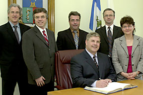 De gauche à droite sur notre photo: le Dr Émile Bouchard, professeur titulaire et directeur du développement et des relations avec les diplômés à la Faculté; le Dr Jean Sirois, doyen de la Faculté; Michel Bruneau, chef régional des ventes, section bovins laitiers, chez Pfizer Canada; Don Sauder, directeur de la division Canada chez Pfizer Canada; Marcel Dupuis, directeur général du développement au Bureau du développement et des relations avec les diplômés de l’Université; et Josée Daigneault, chef des services vétérinaires (porcs) chez Pfizer Canada