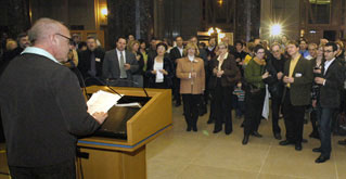Les auteurs et les invités des Presses de l’Université de Montréal remplissaient le Hall d’honneur au lancement animé par Jean Fugère. |