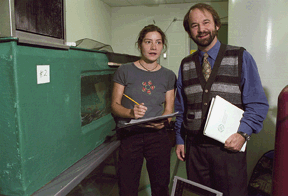 Eva Enders, étudiante au doctorat dirigée par le professeur Daniel Boisclair, mesure la quantité d'énergie dépensée par les jeunes saumons dans le bassin à sa droite où elle peut modifier le débit et la turbulence de l'eau. |