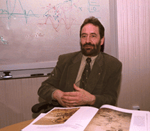 Réjean Plamondon dans son bureau. Sur le tableau, en arrière-plan, figurent les formules mathématiques à l’origine d’un système de vérification des signatures. |