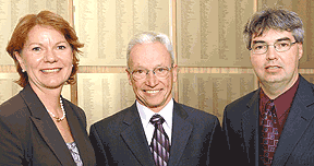 Dans l’ordre habituel, Colette Tracyk, directrice de l’IUGM, Michel Saucier et le doyen Jacques Turgeon. |
