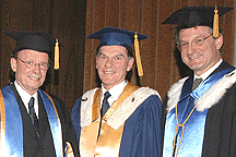 Le juge Charles D. Gonthier en compagnie du recteur Robert Lacroix et de Jacques Frémont, doyen de la Faculté de droit. |