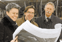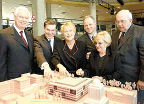 Dans l’ordre habituel, Robert E. Brown, PDG de Bombardier, le recteur Robert Lacroix, la ministre Pauline Marois, le secrétaire d’État Claude Drouin, Janine Bombardier, présidente de la Fondation J. Armand Bombardier, et le directeur de Polytechnique, Robert Papineau, devant la maquette du pavillon qui portera le nom du célèbre inventeur québécois. |