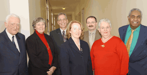 Les conférenciers invités à débattre des défis de l’éducation permanente au colloque: Claude Ryan, critique en éducation et ex-ministre de l’Éducation, Michèle Jean, ex-présidente de la commission Jean et conseillère à la FES, Jean-Marc Boudrias, doyen de la FEP, Céline St-Pierre, ex-présidente du Conseil supérieur de l’éducation, Pierre Simonet, directeur de l’École d’optométrie, Léa Cousineau, présidente de la Commission des partenaires du marché du travail, et Émile Ollivier, président de la Semaine québécoise des adultes en formation et président de l’Institut canadien de l’éducation des adultes. |