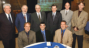 Sur la photo, dans l’ordre habituel: Gil Desautels, directeur du Fonds de développement; le doyen Joseph Hubert; Élie Abdul-Massih, directeur national exécutif (Enseignement supérieur et recherche) à IBM Canada; le recteur Robert Lacroix; Stéphane Dufort, directeur principal (Enseignement supérieur et recherche, section Québec) à IBM Canada; et Laurent Lewis, directeur du Département de physique. Sont assis Matthias Ernzerhof, professeur au Département de chimie, ainsi que Michel Côté et Normand Mousseau. |