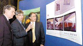 Le recteur Robert Lacroix, le doyen de la Faculté de pharmacie, Jacques Turgeon, et le premier vice-président aux affaires scientifiques à Apotex, Michael Spino, observent le plan de la salle Apotex, qui sera aménagée dans le Pavillon Jean-Coutu. |