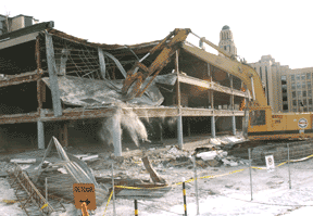 Le Pavillon administratif, construit en 1964 pour un usage de cinq ans, est finalement tombé sous le pic des démolisseurs la semaine dernière. Plusieurs avaient exprimé leur scepticisme quant à la démolition longuement attendue de ce pavillon, dont l’ancien vice-recteur à l’administration Jacques Lucier, qui a tenu à assister au premier coup de pic en compagnie du recteur Robert Lacroix et du directeur de l’École Polytechnique, Robert Papineau. Le site sera bientôt occupé par un nouveau pavillon de l’École Polytechnique.