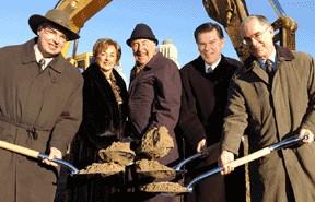 Une première pelletée de terre a été donnée le 17 décembre à l’emplacement des futurs pavillons Marcelle-Coutu et Jean-Coutu. D’ici trois ans, le Pavillon Jean-Coutu logera la Faculté de pharmacie et le Pavillon Marcelle-Coutu sera le siège de l’Institut de recherche en immunovirologie et en cancérologie. Le don personnel de 12,5 M$ de Jean Coutu permettra à la Faculté de pharmacie d’accueillir quelque 500 nouveaux étudiants, alors que le second pavillon créera 163 emplois directs. Sur la photo, dans l’ordre habituel, Jacques Turgeon, doyen de la Faculté de pharmacie, Marcelle Coutu, Jean Coutu, le recteur Robert Lacroix et Pierre Chartrand, directeur général exécutif de l’Institut de recherche en immunovirologie et en cancérologie.
