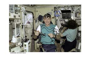 Les astronautes James S. Voss et Susan J. Helm en pleine séance de travail dans la station orbitale. Qu'arrive-t-il si on laisse échapper un objet? Le logiciel SGDL permettrait de prévoir où il serait dans 10 minutes et s'il constitue un danger pour les différents appareils.