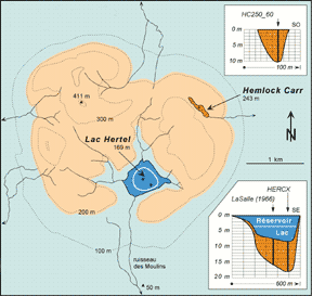 Les prélèvements antérieurs, effectués au lac Hertel en 1966, n’avaient pas dévoilé d’extension marine dans le lac et l’on en avait déduit que la montée des eaux de la mer de Champlain s’était arrêtée plus bas que le lac. Le niveau de la mer de Champlain est maintenant fixé entre 190 et 200 mètres au-dessus du niveau actuel de la mer, soit environ 30 mètres plus haut que le lac Hertel actuel.