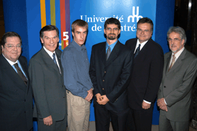 Au cours de cette rencontre, le recteur, Robert Lacroix, a remis la médaille de l’Université à Jean-Claude Gaudet, directeur du collège. Alexandre Debs, diplômé des deux établissements, boursier Rhodes et maintenant étudiant au MIT, ainsi que Francis Loranger, diplômé du collège Jean-de-Brébeuf et étudiant à l’UdeM dans le programme bidisciplinaire en mathématiques et physique, ont livré deux touchants témoignages exprimant leur gratitude à l’égard de leurs deux alma mater. Étaient également présents à la rencontre Guy Berthiaume, vice-recteur aux affaires publiques et au développement (à gauche) et Jacques Boucher, président du comité du 125e de l’Université (à droite).