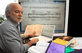 La table de travail de Guy Marchand est nécessairement très garnie: ordinateur, partitions et ouvrages sur Bach en constituent les éléments centraux. |