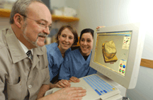 André Prévost, professeur titulaire à la Faculté de médecine dentaire, et deux de ses étudiantes, Tammy Raymond, à gauche, et Stéphanie Rioux, examinent la dent reproduite sur l’écran en trois dimensions. Appelé «cerec» dans le jargon de la profession, cet ordinateur possède non seulement un appareil photo ultraspécialisé, mais également une «machine-outil» qui prend l’empreinte d’une couronne et la modèle pour le patient, tout cela en une seule visite chez le dentiste. |