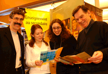 Michel Laurier, doyen de la Faculté des sciences de l’éducation (à gauche), et le recteur Robert Lacroix (à droite) encadrent deux étudiantes qui participent au Salon des études: Mélanie Boucher et Josée Chabot. Mélanie étudie en enseignement des mathématiques au secondaire et Josée en enseignement du français langue seconde. L’étudiante Valérie Lagonelle (photo de droite) était l’animatrice du tour guidé du campus. |