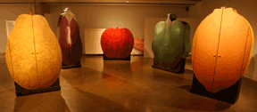 Des modules en forme de fruits et de légumes surdimensionnés renferment des panneauxprésentant les éléments d’information. |