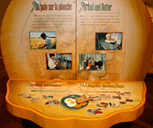 Au fil de la visite, qui comporte un coin pour les petits, on ouvrira les portes d’un garde-manger en forme de citron, de poire, d’aubergine, de poivron ou de citrouille. À l’intérieur, des panneaux interactifs permettent d’absorber sous une forme très digeste une panoplie de renseignements sur des thèmes variés rattachés à la production alimentaire: la monoculture industrielle, les épices, les pesticides, le commerce équitable, etc. Ainsi, un panneau nous demande d’appuyer sur des boutons pour mettre en relation différents aliments (café, pâtes alimentaires, cornichons, confiture) et divers procédés de conservation (lyophilisation, séchage, macération, sucrage). Une lumière s’allume pour chaque bonne réponse. Ailleurs, il s’agira de désigner l’aliment qui porte le sceau certifiant son origine biologique.