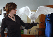 Jacinthe Fréchette, directrice de l’Union québécoise de réhabilitation des oiseaux de proie, un organisme né à la Faculté, a profité de l’occasion pour donner un bain de foule à ce harfang des neiges, symbole aviaire du Québec. |