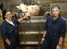 À la suite d’une mise bas ou d’un accident, certains bovins peuvent éprouver des douleurs aux membres au point d’être incapables de se relever. Après 12 heures d’immobilité, la paralysie peut devenir permanente. Cette piscine sert à traiter ces animaux. Nathalie Dumont et Julie Carrier, étudiantes de deuxième année, ont toutes deux l’intention de consacrer leur carrière aux soins des grands animaux. |