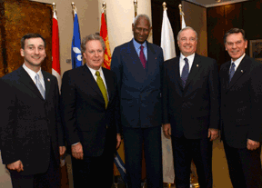De gauche à droite, le premier ministre du Nouveau-Brunswick, Bernard Lord, le premier ministre du Québec, Jean Charest, le secrétaire général de l’Organisation internationale de la Francophonie, Abdou Diouf, le premier ministre du Canada, Paul Martin, et le recteur Robert Lacroix. |