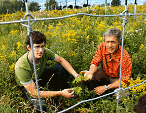 Étienne Laliberté (à gauche) et son directeur de recherche, Alain Cogliastro, ont suivi tout l'été l'évolution de leurs plantations sur l'île Grosbois. Ici, un érable argenté se tire bien d'affaire malgré d'abondants compétiteurs. |