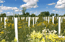 Ces cylindres de toile protègent les plants de chênes, d'érables, de frênes et de peupliers de la gourmandise des cerfs de Virginie, abondants dans le parc. |