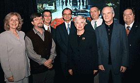 Le 20 octobre, les héritiers du professeur Pierre-Richard Bisson, Ginette Bisson (troisième à l'avant-plan à partir de la gauche) et Serge Daigneault (derrière elle à droite), ont fait don des collections du défunt professeur d'architecture à la Direction des bibliothèques de l'Université. Ainsi, plus de 30 000 diapositives et 4000 livres pourront désormais être consultés à la bibliothèque de la Faculté de l'aménagement. |