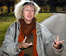 Monique Proulx en entrevue à Forum sur le mont Royal. Impossible, pour cette femme libre, de résister à la tentation de sauter dans les feuilles mortes. |