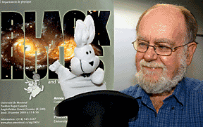 Un cylindre dans lequel sont aspirées des particules de lumière, un lapin qui s’envole dans l’espace à la vitesse d’une fusée, une pièce de 10 ¢ qui traverse une membrane sans la trouer et un jeu de cartes dont les images disparaissent et apparaissent à l’avenant. Voilà quelques trucs que l’«astrophysicien royal» d’Écosse John Brown a sortis de son chapeau pour illustrer, devant 400 personnes le 20 janvier dernier, des concepts régissant l’Univers. «Black Holes and White Rabbits» («Trous noirs et lapins blancs»), tel était le titre de la conférence inaugurale de l’Année internationale de la physique à l’Université de Montréal.