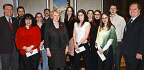 Au centre à gauche, Françoise Gervais-Hérald à la remise, le 8 mars, des premières bourses du fonds créé par un don testamentaire de son mari. Elle est entourée, de gauche à droite, du recteur, Robert Lacroix, des boursiers Jonathan Petit, Ingrid Rodriguez-Santibanez, Karen Rivard, Gabriel Garcia Herrera, Isabelle Vaillant, Marie-Jeanne Rivard, Sophie Galvao, Annie Castonguay, Julie Desrosiers et Daniel Poitras, ainsi que du vice-recteur aux affaires publiques et au développement, Guy Berthiaume. |